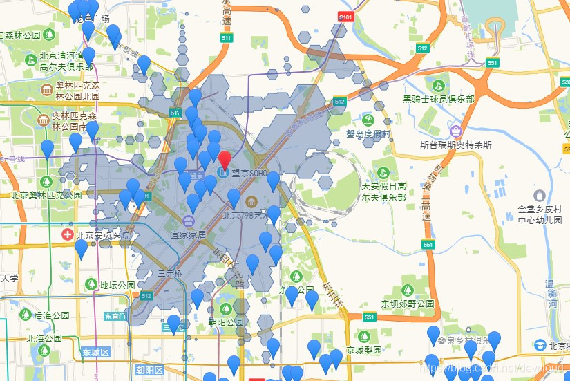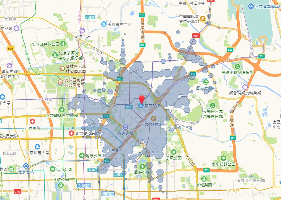 下面我们以在北京望京SOHO附近租房为例,首先输入地址,地图中蓝色块就是距离望京SOHO一小时车程(地铁+公交)的范围。
