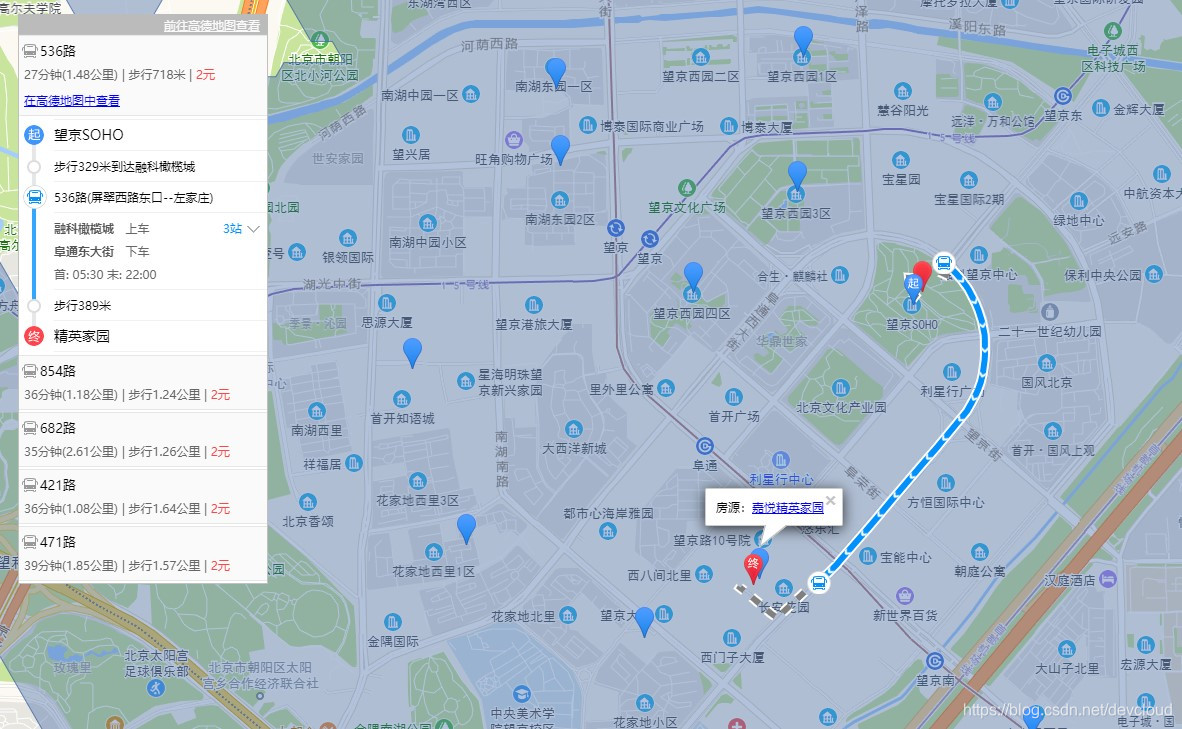 在蓝色区域里任意点击一个蓝色地点标记,可以获取房源所在的小区,点击小区名称会自动跳转到58同城的页面,列出房源的详细信息(地址、租金、环境),同时自动规划出从房源到公司的路径。