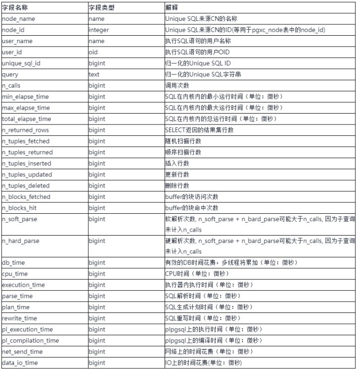 SELECT user_name, unique_sql_id, query, total_elapse_time FROM pgxc_instr_unique_sql ORDER BY total_elapse_time ASC 或 DESC;