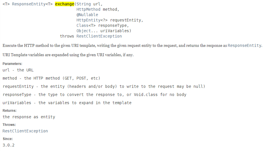 首先是需要5个参数:url,指定的HTTP方法(比如POST, GET),需要写入请求的实体(头部和主体 或 头部 或 主体,也可以是null) ,响应消息的类型和扩展模板的变量 以及 最后会返回ResponseEntity<T>。