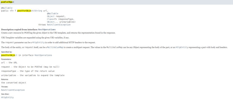 首先是需要三个参数:url,需要POST上去的对象(可以是null) 和扩展模板的变量 以及 最后会返回ResponseEntity<T>。