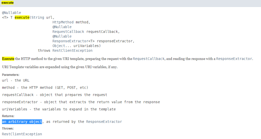 当然该函数的参数也可以是"url,指定的HTTP方法(比如POST, GET),功能性的接口RequestCallback(准备请求的对象;可以是null),从响应消息里提取返回值的对象(可以是null)和包含uri模板值的map" / "URI格式的url,指定的HTTP方法(比如POST, GET),功能性的接口RequestCallback(准备请求的对象;可以是null),从响应消息里提取返回值的对象(可以是null)"。