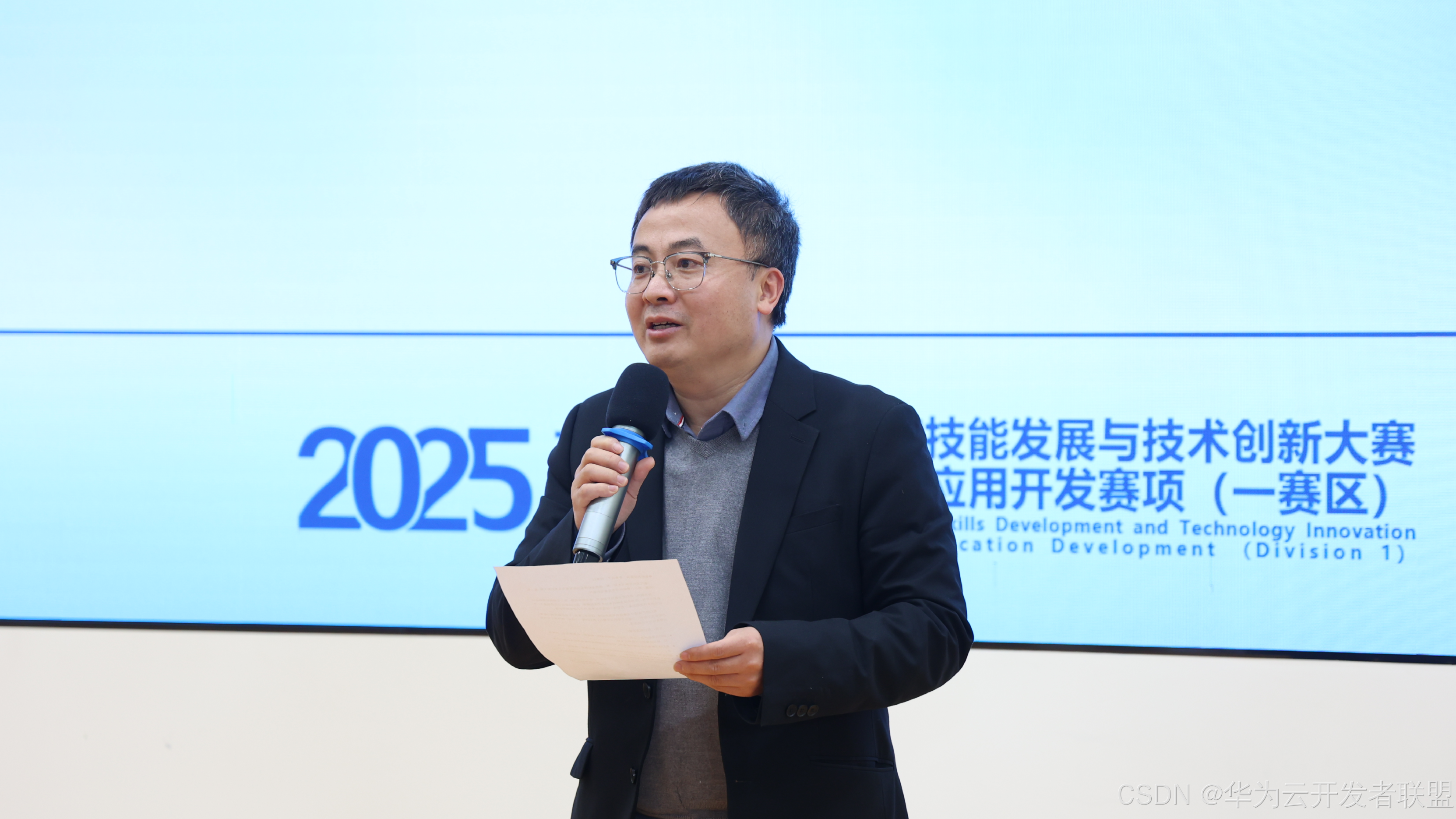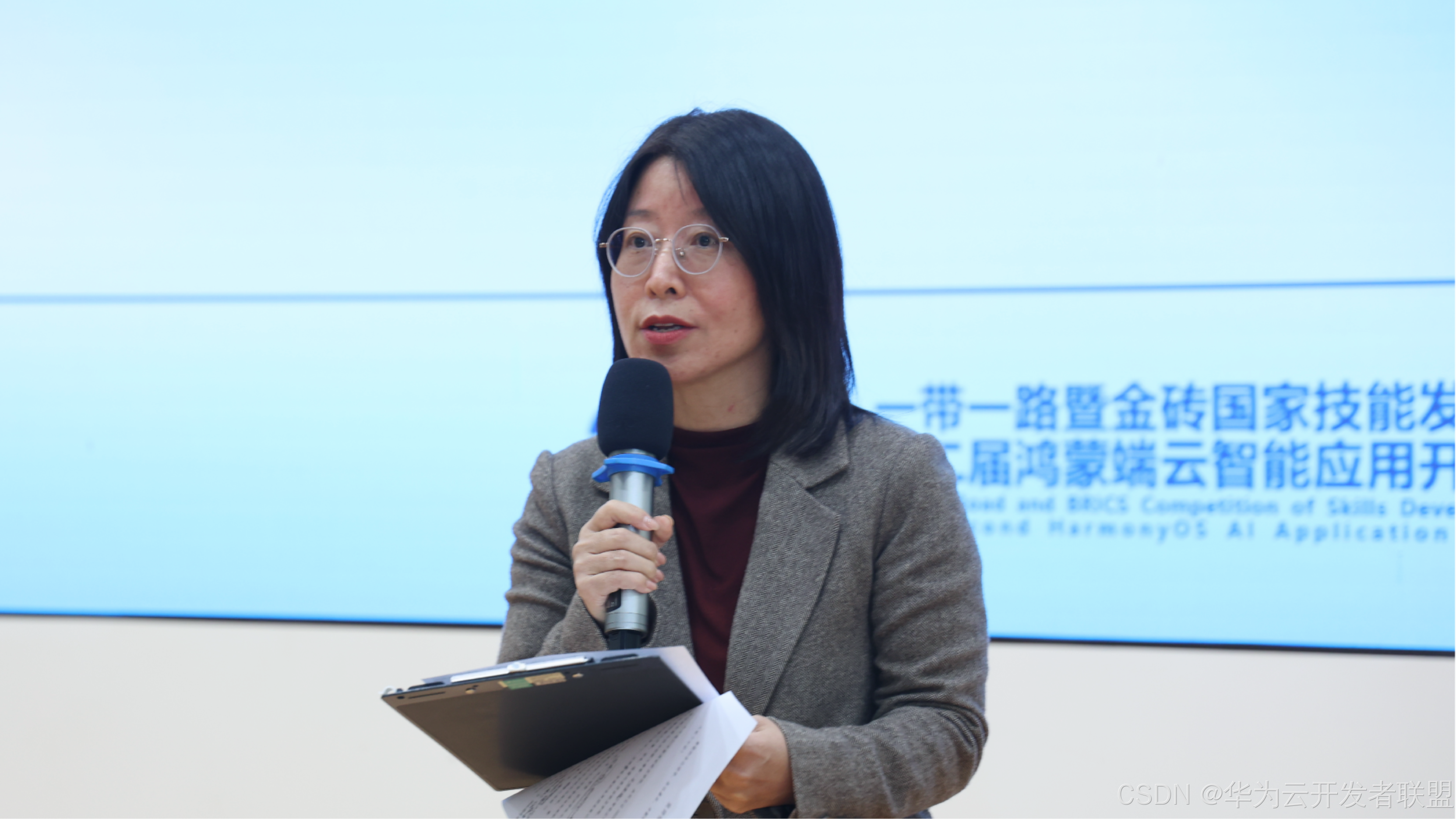 华为云云学堂高校运营总监赵水清在致辞中表示,企业的长远发展离不开开放共赢的生态体系,而人才正是生态的核心驱动力。通过竞赛,我们鼓励学生深入探索鸿蒙端云智能应用开发知识,挖掘应用开发的创新应用,为构建更加丰富、高效的智能生态系统贡献智慧和力量。此外,赵水清简单介绍了贯穿本赛项的两个平台,“华为云学堂”作为一站式成长平台,它集系统化课程、沙箱实验与华为云开发者认证于一体,提供从知识积累、动手实践到技能认证的全流程支持。而华为开发者空间作为开发者专属的云上成长空间,预置免费华为根技术工具和资源,为开发者提供从学习、开发到部署的全旅程支持。希望参赛选手借助平台能力,在比赛中取得好成绩。