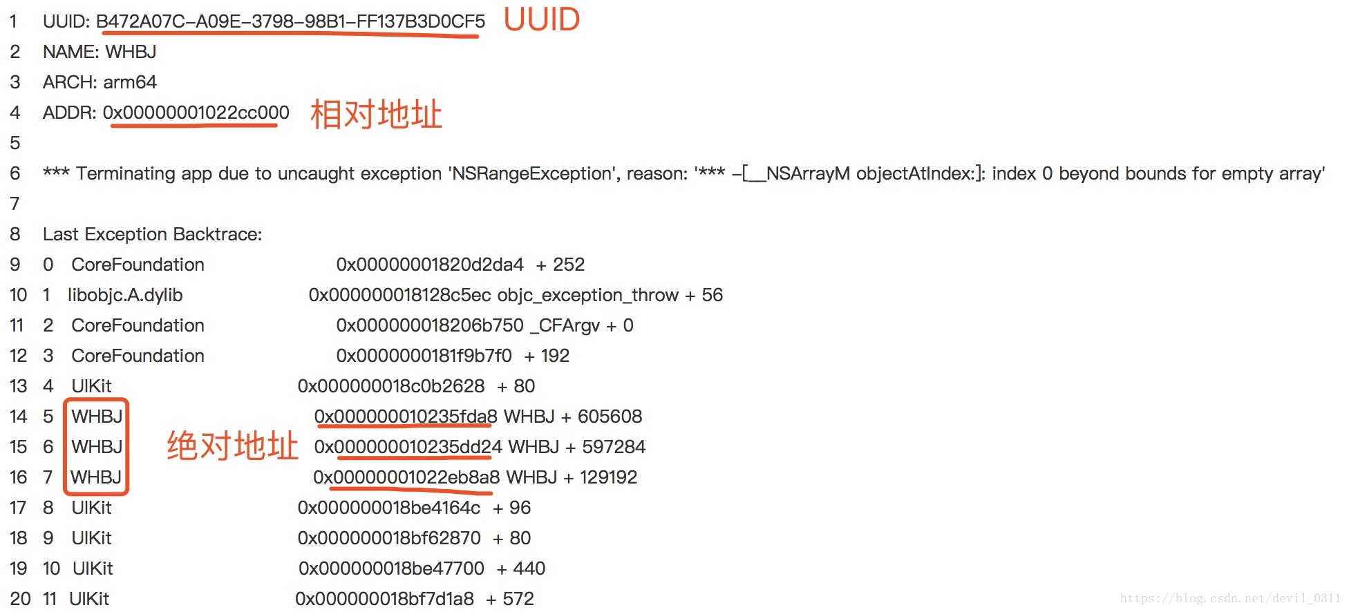iOS crash崩溃日志符号化方法 百度官方也有提供手动解析的方法,但是文档不是很详细,我试了没有成功,暂不清楚是哪步搞错了。以下是我结合网上教程总结出来的方法,亲测有效。1、分析错误日志。在百度统计平台找到错误信息,找到UUID、相对地址、绝对地址,如下图:注意:绝对地址要你的app名称后面的才有用,这里我的app名称为WHBJ。2、找到提交app时使用的.xcarchive文件和.dSYM文件(以下app...