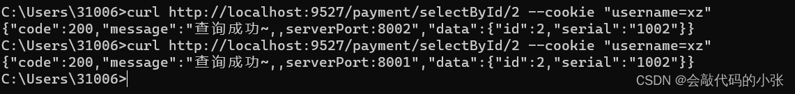 启动两台服务器,8001和8002;访问localhost:9527/lb查看是否负载均衡