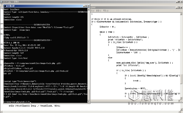 比如我们直接就可以上传一个扩展名是.php的文件,只需要简单地绕过客户端javascript 检测或者服务端MIME 类型检测就行了。