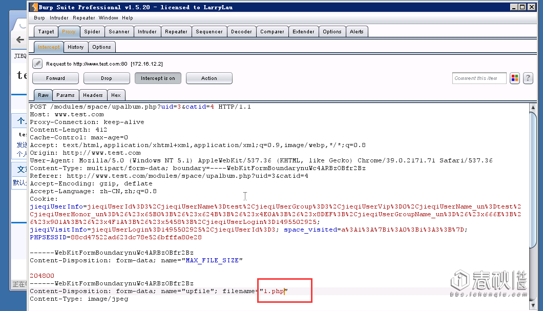 打开http 反向代理工具burp,先随便点击上传一个1.php