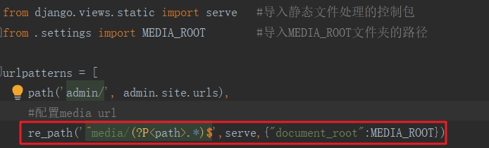 2.MEDIA_URL = '/media/' #相当路径 指定url路径 映射到MEDIR_ROOT存储路径