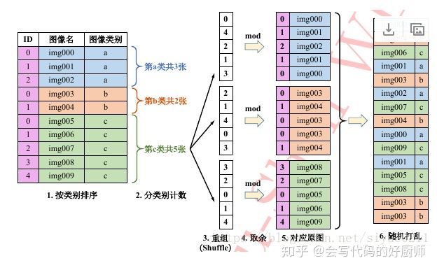 1. 首先按照类别顺序对原始样本进行排序,之后计算每个类别的样本数目,并记录样本最多那个类的样本数目。之后,根据这个最多样本数对每类样本产生一个随机排列的列表, 然后用此列表中的随机数对各自类别的样本数取余,得到对应的索引值。接着,根据索引从该类的图像中提取图像,生成该类的图像随机列表。之后将所有类的随机列表连在一起随机打乱次序,即可得到最终的图像列表,可以发现最终列表中每类样本数目均等。根据此列表训练模型,在训练时列表遍历完毕,则重头再做一遍上述操作即可进行第二轮训练,如此往复。 类别重组法的优点在于,只需要原始图像列表,且所有操作均在内存中在线完成,易于实现。