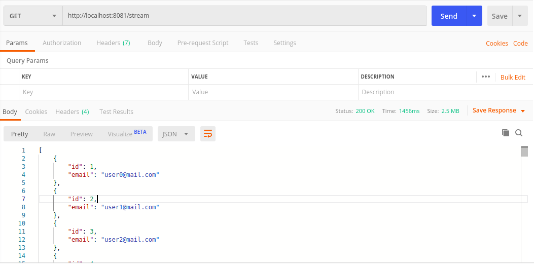 好的,所有这些都准备就绪,我现在可以测试两个端点并查看它们的性能如何。 让我们从nostream端点开始: