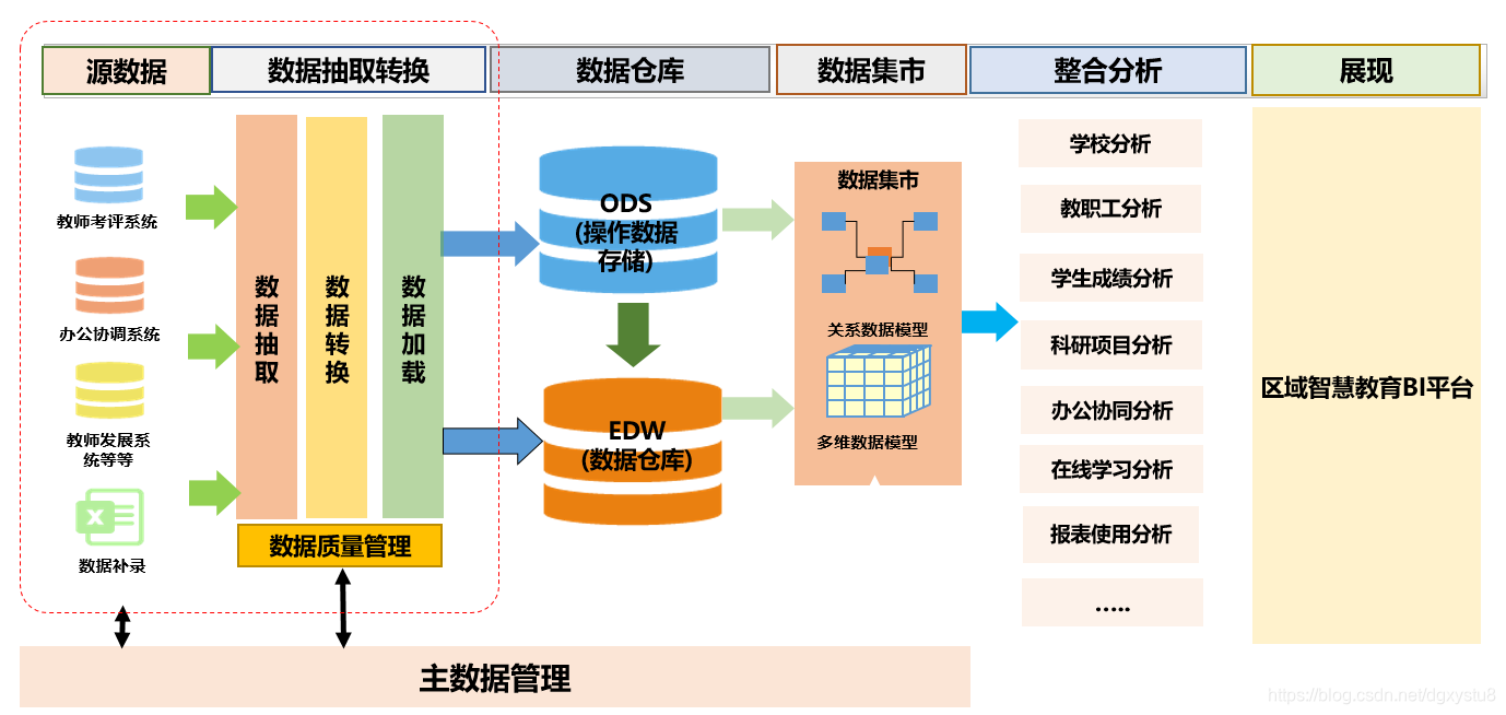 总体架构示意如下:其中数据源、数据抽取转换、数据仓库、数据集市、整合分析、展现等。