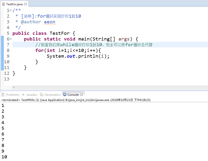 /** * [说明]:for循环实现打印1到10 * @author aeon */ public class TestFor { public static void main(String[] args) { //前面我们用while循环打印1到10、完全可以用for循环去代替 for(int i=1;i<=10;i++){ System.out.println(i); } } }