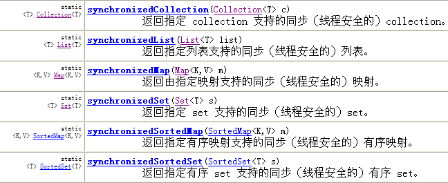 // public static <T> List<T> synchronizedList(List<T> list) List<String> list1 = new ArrayList<String>();// 线程不安全 List<String> list2 = Collections.synchronizedList(new ArrayList<String>()); // 线程安全