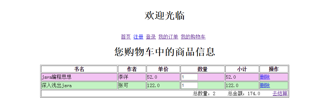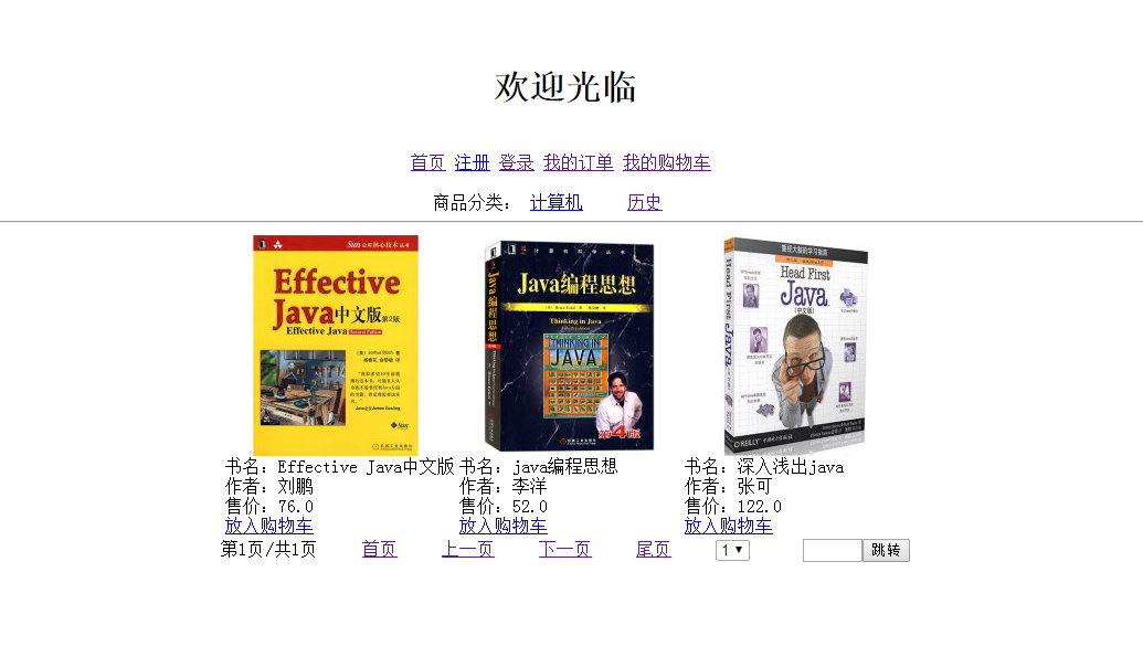 (2)前台功能:普通用户在网站注册登录后,可以浏览各个分类下的图书信息,加入购物车,模拟支付下订单。