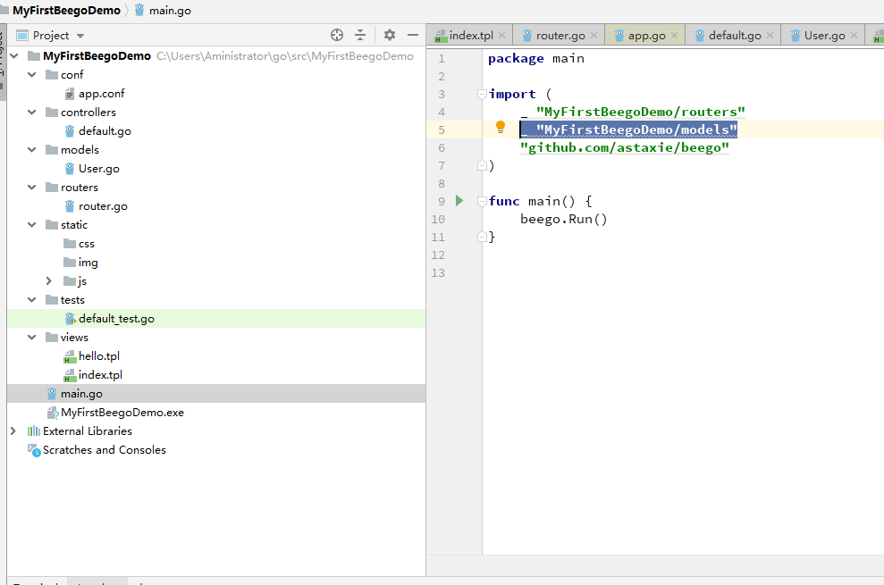 连接字符串自行设置,另外需要在main.go文件添加orm启动包: