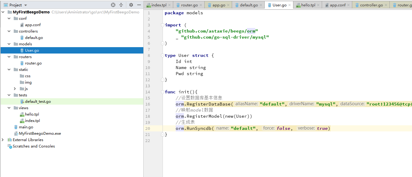 添加实体模型,配置orm启动方法,运行bee run名称生成数据库架构: