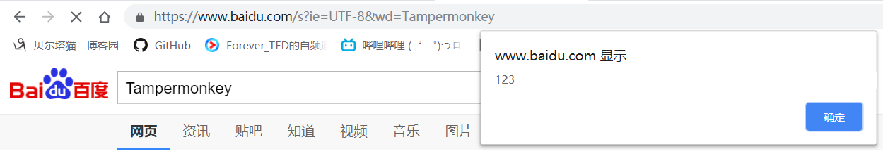 // ==UserScript== // @name New Userscript // @namespace http://tampermonkey.net/ // @version 0.1 // @description try to take over the world! // @author You // @match https://www.baidu.com/* // @grant none // ==/UserScript== (function() { 'use strict'; window.alert('123'); })();