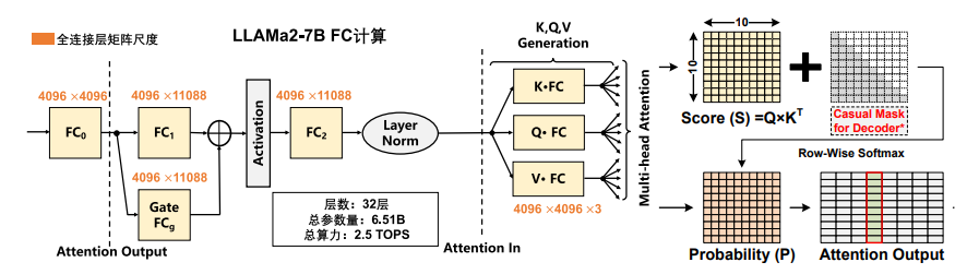 下图展示了一个拥有70亿参数的大型模型(LLAMa2-7B),该模型的每一层多头注意力都包括多个连续前馈(FCL)计算。单层参数量达到2.03亿,而32层的参数总量达到65亿,占用整体系数和计算的85%以上,远超过单一互补金属氧化物半导体(CMOS)芯片的片上存储空间。注意力模块的计算存储要求相对较低,CPU/中等性能网络处理器(NPU)即可完成。
