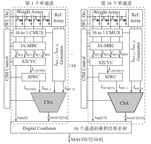 在下图中的"Ref. Array"模块中,忆阻器阵列充当了产生IREF_L和IREF_H电流的参考阵列(dummy 阵列)。在这个阵列中,所有的忆阻器都被设定为低阻态。这种设计旨在提供用于比较的基准电流,以便在存内计算中进行阈值比较。通过与参考阵列中的忆阻器阻值进行比较,可以确定存储卷积核权重信息的忆阻器阵列中每个忆阻器的阻值状态,从而完成计算过程中的权重计算和阈值比较。