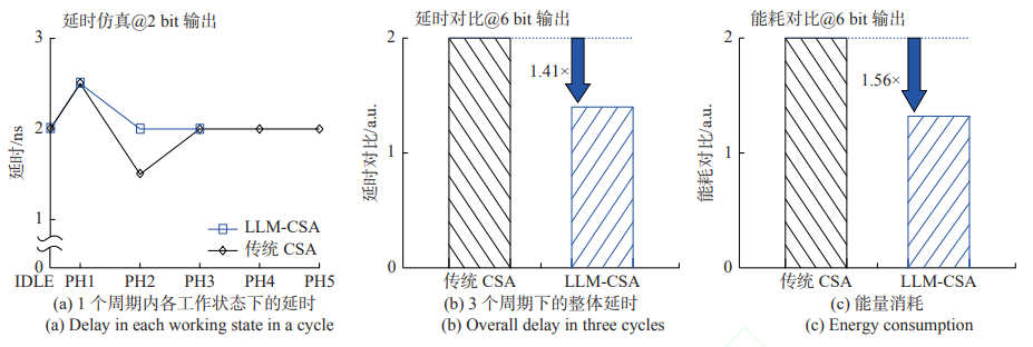 本节介绍了一种低延时低能耗的多位电流型感知放大器(LLM-CSA),并通过基于忆阻器阵列的多位存内计算架构进行了验证。相较于传统的CSA,LLM-CSA电路通过减少每个量化周期的工作状态数量和简化量化时的工作时序,优化了功能。它采用了纯组合电路(低位检测电路)来替代时序逻辑电路(输出解码电路),以多层次地降低输出延时并优化能耗。仿真结果显示,与传统CSA相比,LLM-CSA的延时降低了1.41倍,能量消耗降低了1.56倍。此外,忆阻器阵列多位存内计算电路系统的延时降低了1.18倍,能耗降低了1.03倍。综合分析仿真结果表明,LLM-CSA能够有效提升存内计算的延时性能,并优化能耗。