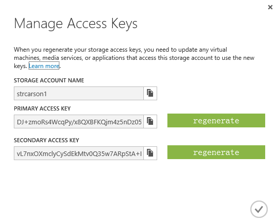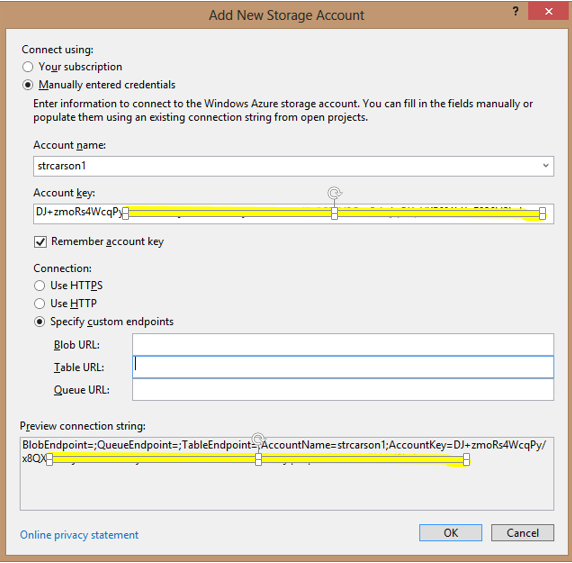 - Copy the strings to VS 2012 new window "Add New Storage Account"