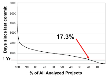 从此分析中,我们可以看到,只有一小部分已创建的项目能够获得并维持长期的吸引力。 这似乎很明显,但是活动很重要。 没有活跃的项目团队,您几乎没有机会修复所依赖项目的错误。 因此,请务必检查您正在考虑使用的任何项目的活动级别。
