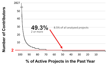 此外,我们发现在这17.3%的项目中,只有一半的项目有两个或多个积极参与该项目的开发人员。 这意味着所有项目中约有8.5%仍在活动中, 如图2所示。