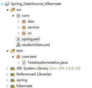 <?xml version="1.0" encoding="UTF-8"?> <beans xmlns="http://www.springframework.org/schema/beans" xmlns:xsi="http://www.w3.org/2001/XMLSchema-instance" xmlns:context="http://www.springframework.org/schema/context" xmlns:aop="http://www.springframework.org/schema/aop" xsi:schemaLocation="http://www.springframework.org/schema/beans http://www.springframework.org/schema/beans/spring-beans.xsd http://www.springframework.org/schema/context http://www.springframework.org/schema/context/spring-context.xsd http://www.springframework.org/schema/aop http://www.springframework.org/schema/aop/spring-aop.xsd"> <bean id="myDataSource" class="org.apache.commons.dbcp.BasicDataSource" destroy-method="close"> <property name="driverClassName" value="com.mysql.jdbc.Driver"/> <property name="url" value="jdbc:mysql://localhost:3306/hibernate"/> <property name="username" value="root"/> <property name="password" value="123456"/> </bean> <bean id="mySessionFactory" class="org.springframework.orm.hibernate4.LocalSessionFactoryBean"> <property name="dataSource" ref="myDataSource"/> <property name="mappingResources"> <list> <value>student.hbm.xml</value> </list> </property> <property name="hibernateProperties"> <value> hibernate.dialect=org.hibernate.dialect.MySQLDialect </value> </property> </bean> <bean id = "dao" class="com.dao.UserDaoImpl"> <property name="sessionFactory" ref="mySessionFactory"></property> </bean> <bean id="userService" class="com.service.UserService"> <property name="dao" ref="dao"></property> </bean> </beans>