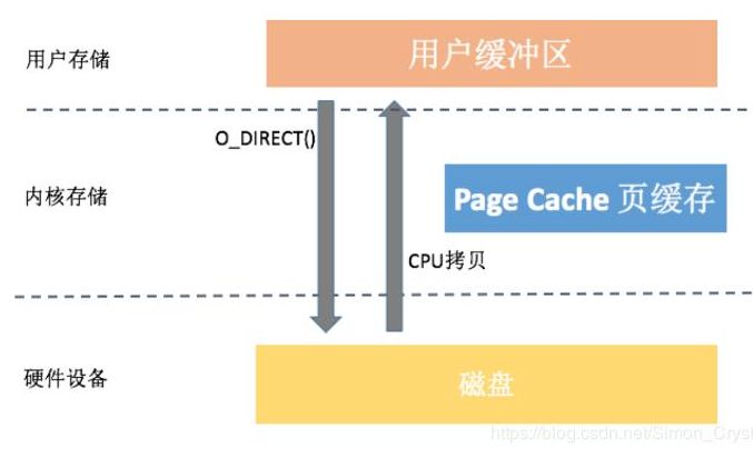 直接IO的缺点:如果访问的数据不在应用程序缓存中,那么每次数据都会直接从磁盘加载,这种直接加载会非常缓慢。通常直接IO与异步IO结合使用,会得到比较好的性能。(异步IO:当访问数据的线程发出请求之后,线程会接着去处理其他事,而不是阻塞等待)。