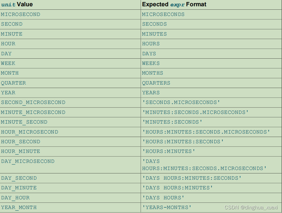 - EXTRACT 函数和INTERVAL的unit时间单位参数见附录4.3
