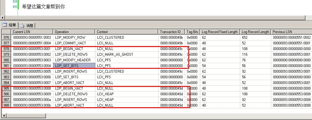 第三列显示出一个记录的删除使用了鬼影记录,另外,可以看到有设置PFS页里的位图中的位