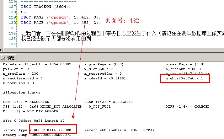 1 USE [GPOSDB] 2 GO 3 CREATE TABLE t1 ( c1 CHAR(10) ) 4 CREATE CLUSTERED INDEX t1c1 ON t1 (c1) 5 GO 6 BEGIN TRAN PaulsTran 7 INSERT INTO t1 VALUES ( 'PAUL' ) 8 INSERT INTO t1 VALUES ( 'KIMBERLY' ) 9 DELETE FROM t1 WHERE c1 = 'KIMBERLY'; 10 GO 11 12 DBCC IND ('GPOSDB', 't1', 1); 13 GO 14 ----------------------- 15 --补充一下:DBCC IND 里的page type列 16 PageType 17 Page type: 18 1 = data page, 19 2 = index page, 20 3 = LOB_MIXED_PAGE, 21 4 = LOB_TREE_PAGE, 22 10 = IAM page 23 24 ---------------------- 25 DBCC TRACEON (3604); 26 GO 27 DBCC PAGE ('gposdb', 1, 482, 3); 28 DBCC PAGE ('gposdb', 1, 482, 2);