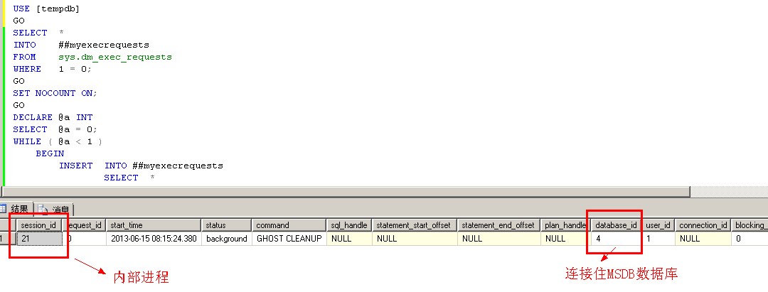 1 USE [tempdb] 2 GO 3 SELECT * 4 INTO ##myexecrequests 5 FROM sys.dm_exec_requests 6 WHERE 1 = 0; --where 1=0 只复制架构 7 GO 8 SET NOCOUNT ON; 9 GO 10 DECLARE @a INT 11 SELECT @a = 0; 12 WHILE ( @a < 1 ) 13 BEGIN 14 INSERT INTO ##myexecrequests 15 SELECT * 16 FROM sys.dm_exec_requests 17 WHERE command LIKE '%ghost%' 18 SELECT @a = COUNT(*) 19 FROM ##myexecrequests 20 END; 21 GO 22 SELECT * 23 FROM ##myexecrequests; 24 GO 25 DROP TABLE [##myexecrequests]