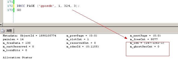 1 DBCC PAGE ('gposdb', 1, 324, 3); 2 GO 3 4 DBCC PAGE ('gposdb', 1, 324, 2); 5 GO