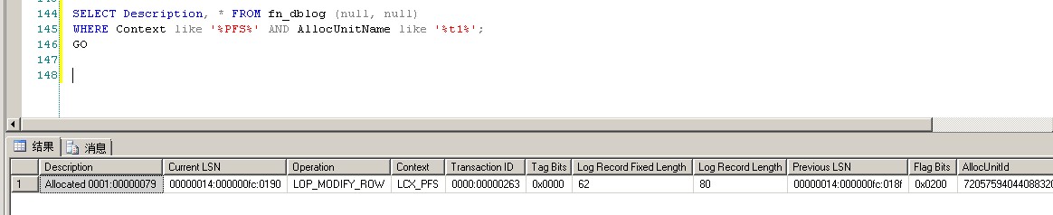1 SELECT Description, * FROM fn_dblog (null, null) 2 WHERE Context like '%PFS%' AND AllocUnitName like '%t1%'; 3 GO