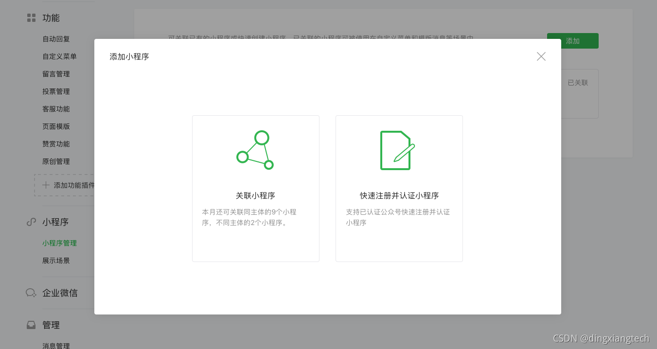 1)用管理员身份登录微信公众平台,请使用需要公众号的相关账号(微信公众平台采用不同账号区分,公众号的后台和小程序的后台分别为不同账号),依次点击:小程序-小程序管理-添加-关联小程序,然后输入小程序AppID“wx82db4a59175bdfdf”并搜索,如下图所示:
