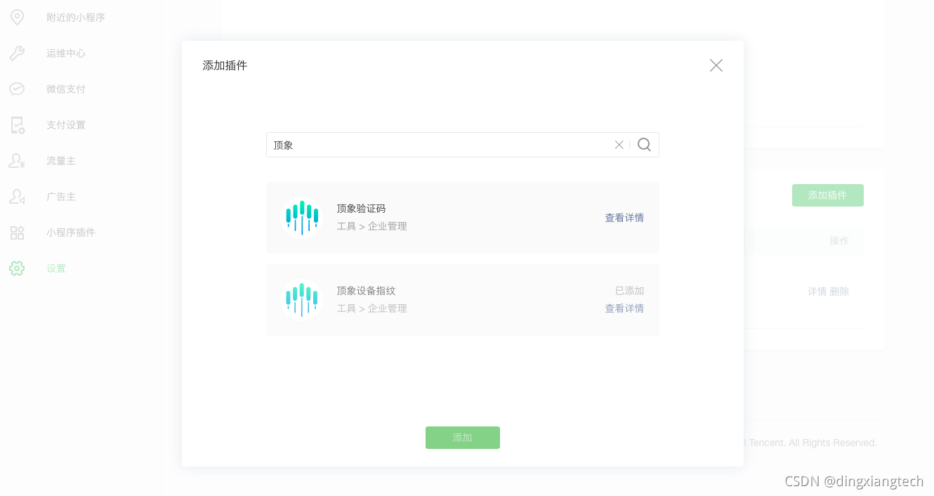 1)用管理员身份登录微信公众平台,请使用需要接入小程序的相关账号(微信公众平台采用不同账号区分,公众号的后台和小程序的后台分别为不同账号),依次点击:设置-第三方服务-添加插件,然后输入关键字“顶象”并搜索,如下图所示: