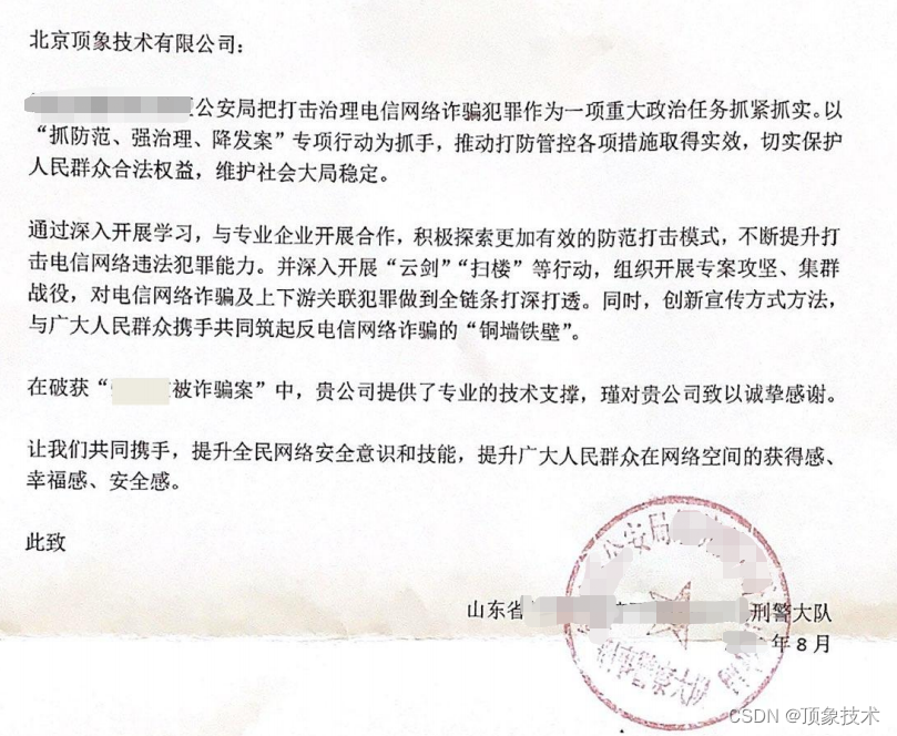 2021年8月,顶象收到某地公安局的一封致谢信。感谢顶象在破获某个电信网络诈骗案件中,提供的专业技术支撑。这是顶象业务安全情报产品在反电信网络诈骗上的首次应用。
