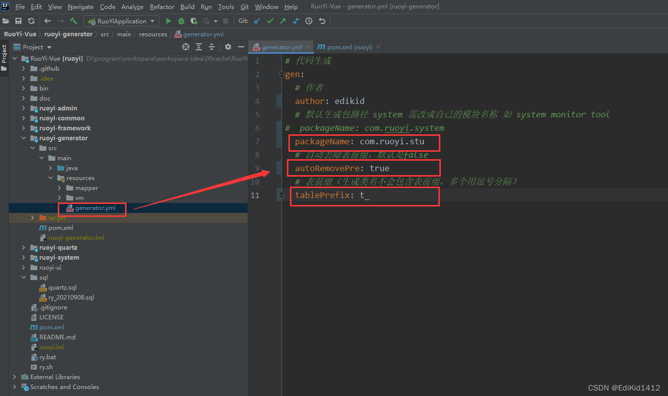 多模块:编辑ruoyi-generator中的resources目录下的generator.ym
