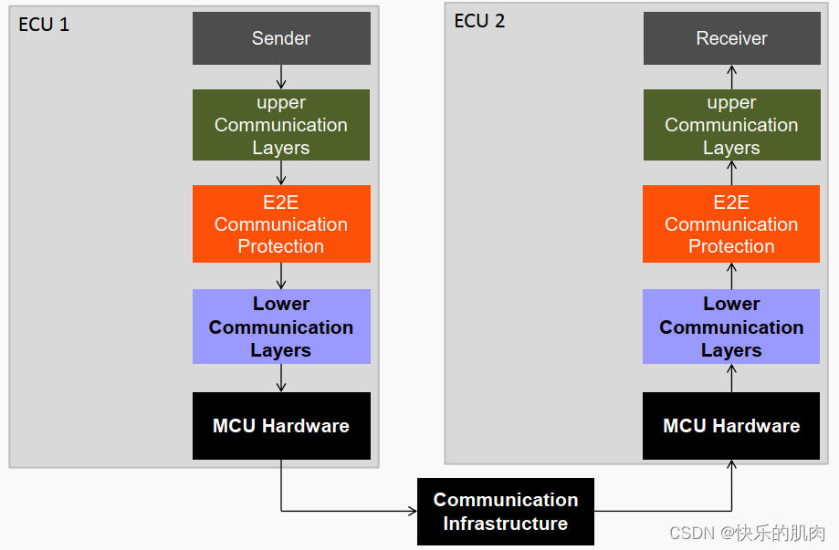 E2E,全称叫做End To End。这个概念的提出是用于保护在ECU运行时与安全相关的数据交换不受通信链路中故障的影响。根据AUTOSAR E2E Protocol Specification描述,基于E2E的通信可以按照如下示例: