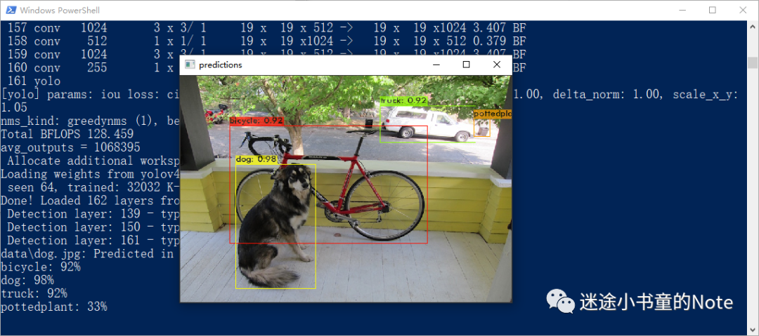 最后我们来测试一下,将Debug\darknet.exe和3rdparty\pthreads\bin下的pthreadGC2.dll和pthreadVC2.dll都拷贝到darknet源码根目录下,除此以外,还要准备权重文件yolov4.weights