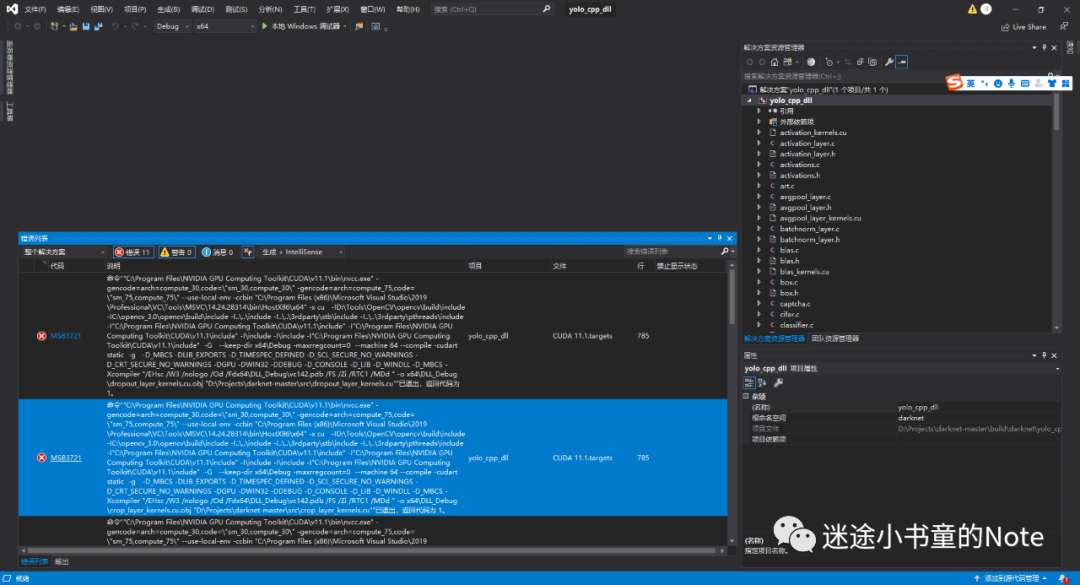 错误 MSB3721 命令“"C:\Program Files\NVIDIA GPU Computing Toolkit\CUDA\v11.1\bin\nvcc.exe" -gencode=arch=compute_30,code=\"sm_30,compute_30\" -gencode=arch=compute_75,code=\"sm_75,compute_75\" --use-local-env -ccbin "C:\Program Files (x86)\Microsoft Visual Studio\2019\Professional\VC\Tools\MSVC\14.24.28314\bin\HostX86\x64" -x cu -ID:\Tools\OpenCV\opencv\build\include -IC:\opencv_3.0\opencv\build\include -I..\..\include -I..\..\3rdparty\stb\include -I..\..\3rdparty\pthreads\include -I"C:\Program Files\NVIDIA GPU Computing Toolkit\CUDA\v11.1\include" -I"C:\Program Files\NVIDIA GPU Computing Toolkit\CUDA\v11.1\include" -I\include -I\include -I"C:\Program Files\NVIDIA GPU Computing Toolkit\CUDA\v11.1\include" -G --keep-dir x64\Debug -maxrregcount=0 --machine 64 --compile -cudart static -g -D_MBCS -DLIB_EXPORTS -D_TIMESPEC_DEFINED -D_SCL_SECURE_NO_WARNINGS -D_CRT_SECURE_NO_WARNINGS -DGPU -DWIN32 -DDEBUG -D_CONSOLE -D_LIB -D_WINDLL -D_MBCS -Xcompiler "/EHsc /W3 /nologo /Od /Fdx64\DLL_Debug\vc142.pdb /FS /Zi /RTC1 /MDd " -o x64\DLL_Debug\crop_layer_kernels.cu.obj "D:\Projects\darknet-master\src\crop_layer_kernels.cu"”已退出,返回代码为 1。yolo_cpp_dll C:\Program Files (x86)\Microsoft Visual Studio\2019\Professional\MSBuild\Microsoft\VC\v160\BuildCustomizations\CUDA 11.1.targets 785