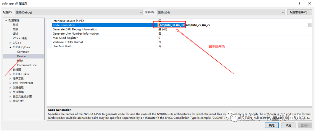 接下来,右键点击解决方案,进入到项目属性,点击CUDA C/C++ --> Device,找到Code Generation,将compute_30;sm_30删除,然后保存,重新生成