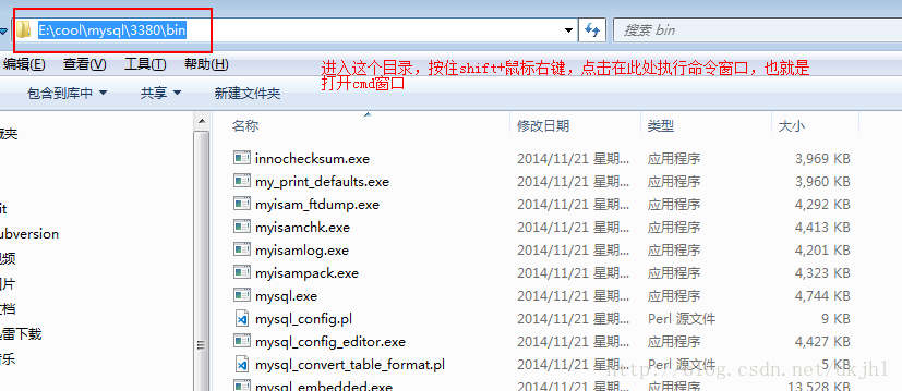 第一步:复制mysql到自定义目录中,我现在放的是 E:\cool\mysql,数据库叫3380