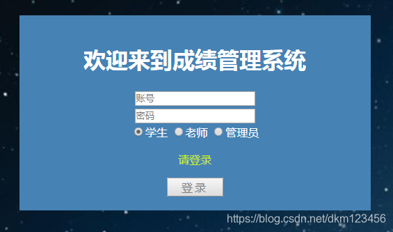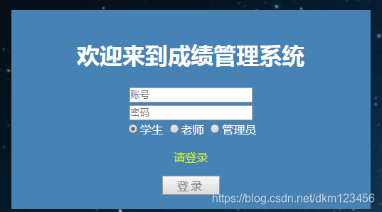 登录模块3个角色来分别登录,当选择管理员的时候用户名密码:admin/admin,因为目前是写的固定值,哈哈(偷懒),选择学生的话会查询student学生表验证,选择老师的话后台会去查teacher老师表来判断用户名密码是否正确(type为t代表 老师,s 代表学生,a代表管理员admin)。