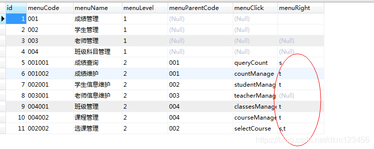 `menuRight` varchar(8) default NULL COMMENT '权限s表示学生,t表示老师,管理员拥有全部',