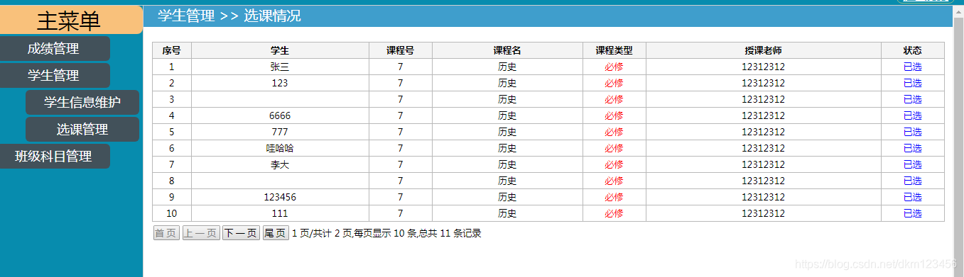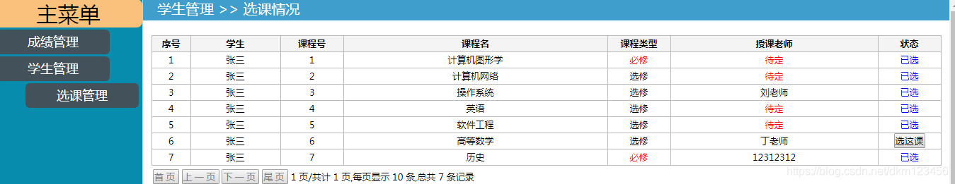 学生是权限最小的角色,仅有成绩查询、选课两个功能。