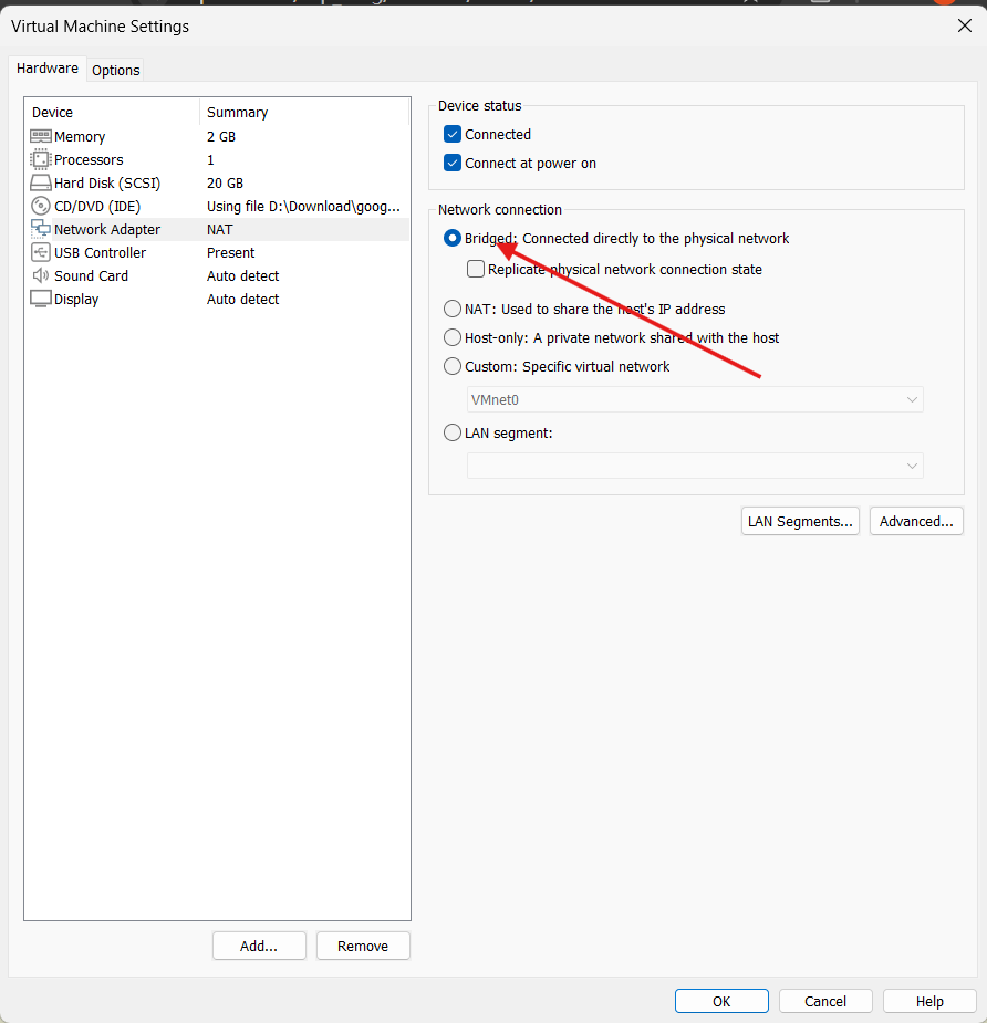 在虚拟机设置中,将网络设置中设置为桥接模式