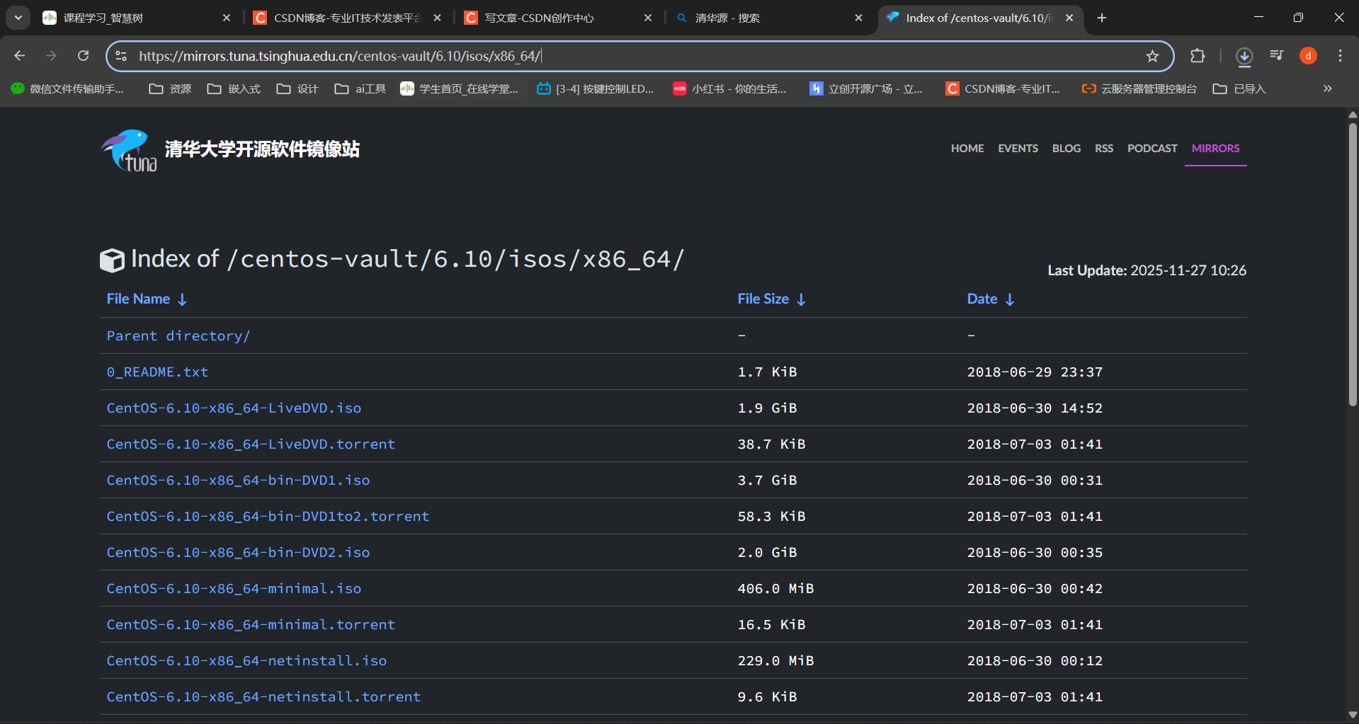 1.根据课程,我们使用centos6,官网已经删除了旧版本,打开会显示403,所以直接去清华源上找,根据如图所示路径,点击3.7GB的下载: