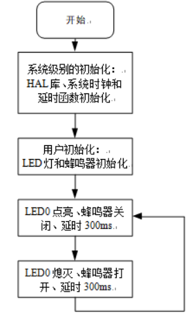 本实验用到 GPIO 外设输出功能,关于 HAL 库的 GPIO 的 API 函数请看跑马灯实验的介绍。下面是本实验的程序流程图。